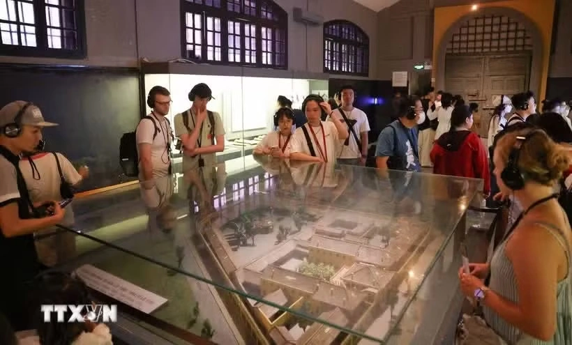 Du khách sử dụng bộ đàm thuyết minh tự động khi tham quan di tích Nhà tù Hỏa Lò, Hà Nội. (Ảnh: Thanh Tùng/TTXVN)