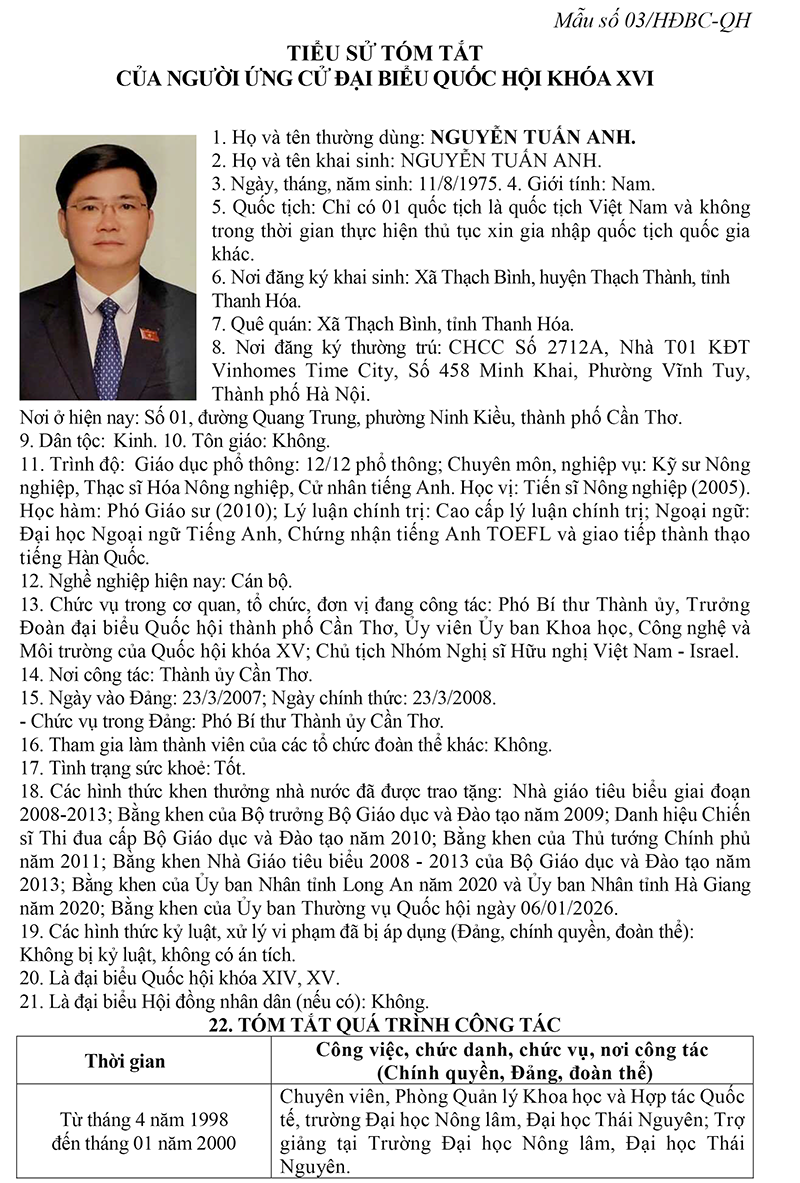 Ông Nguyễn Tuấn Anh - Phó Bí thư Thành ủy, Trưởng đoàn đại biểu Quốc hội thành phố Cần Thơ | Đơn vị bầu cử số 3